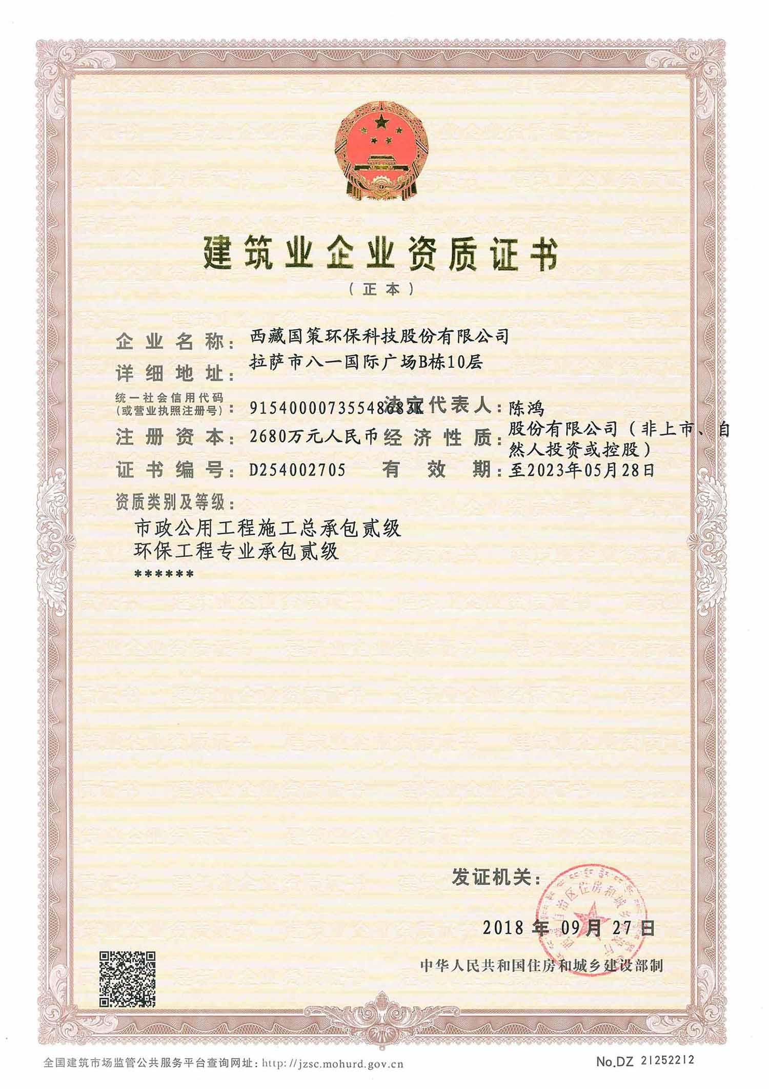 國策環(huán)保擁有住房和城鄉(xiāng)建設(shè)部頒發(fā)的建筑業(yè)企業(yè)市政公用工程施工總承包貳級資質(zhì)、環(huán)保工程專業(yè)承包貳級資質(zhì),同時擁有環(huán)保、市政、機電等各類專業(yè)工程技術(shù)人員共計40余人,并先后承擔了眾多污水廠、垃圾填埋場、自來水廠、醫(yī)療廢物處置中心等項目的施工任務(wù)。