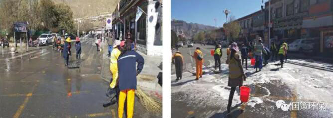 當(dāng)天11:00~17:00,我公司出動大型灑水車2輛、人行道洗地車1輛、環(huán)衛(wèi)工人及管理人員共45人對扎寺廣場和珠峰西路(扎寺廣場至體育路路口)的路面進(jìn)行沖洗,共計(jì)出動灑水車8車次,沖洗面積達(dá)20000平方米,耗資15000元。