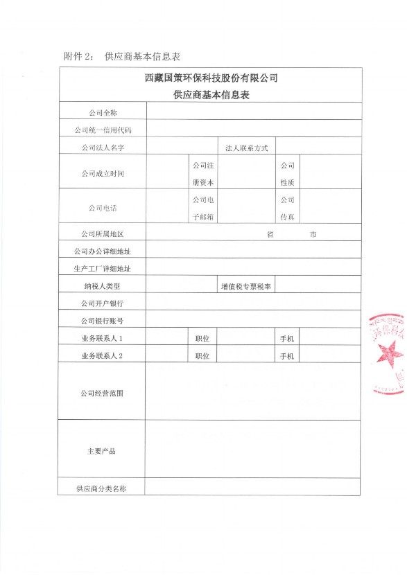 為規(guī)范西藏國(guó)策環(huán)??萍脊煞萦邢薰荆ㄒ韵潞?jiǎn)稱國(guó)策環(huán)?;蚬荆┎少?gòu)行為,加強(qiáng)采購(gòu)管理,維護(hù)公司采購(gòu)當(dāng)事人的合法權(quán)益,更好地與廣大供應(yīng)商合作,依據(jù)公司采購(gòu)管理、供應(yīng)商管理有關(guān)制度的規(guī)定,公司現(xiàn)征集采購(gòu)供應(yīng)商入庫(kù)登記,以建立規(guī)范完整的供應(yīng)商信息庫(kù)。歡迎各企業(yè)(供應(yīng)商)踴躍入庫(kù),現(xiàn)將有關(guān)事宜通知如下: