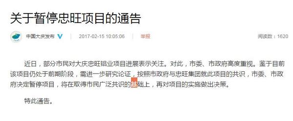 黑龍江大慶市委宣傳部官方微博今日發(fā)布《關(guān)于暫停忠旺項目的通告》稱,近日,部分市民對大慶忠旺鋁業(yè)項目進展表示關(guān)注。對此,市委、市政府高度重視。鑒于目前該項目仍處于前期階段,需進一步研究論證,按照市政府與忠旺集團就此項目的共識,市委、市政府決定暫停項目,將在取得市民廣泛共識的基礎(chǔ)上,再對項目的實施做出決策。